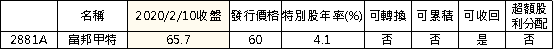 富邦甲特在發行公告中所載的4.1%是「票面利率」之概念,故乘以發行價格60元,每年實際領取的股利為 4.1% x 60 =2.46 (元/每股)。