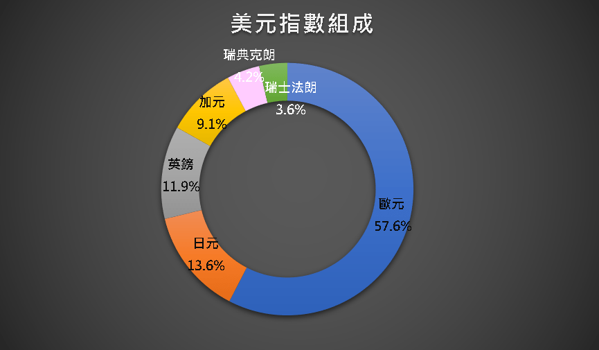 美元指數由6種國際貨幣所構成,分別為:「歐元、日元、英鎊、加元、瑞典克朗、瑞士法郎」,權重各不相同,詳如下列公式。