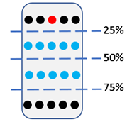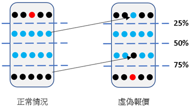 但假若A銀行虛偽報價,使利率成為最低的25%(即落在整體報價的75%,紅色點),則造成原本該被納入的一個藍色點報價遭剔除、另外一個過低的黑色點報價被納入。