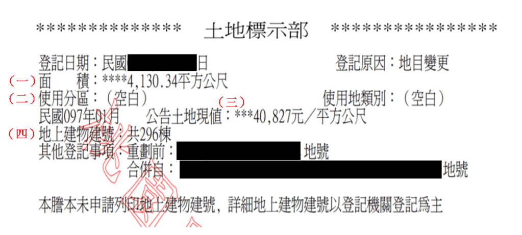 (三)權利範圍:土地所有權人的持份比例,通常透天土地持份會顯示一分之一,公寓或電梯大樓會另有比例。