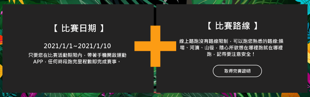 報名後,只要在 2021/1/1~2021/1/10 期間開起運動紀錄APP,跑完指定里程數:3K、5K、10K,就算完成比賽啦~